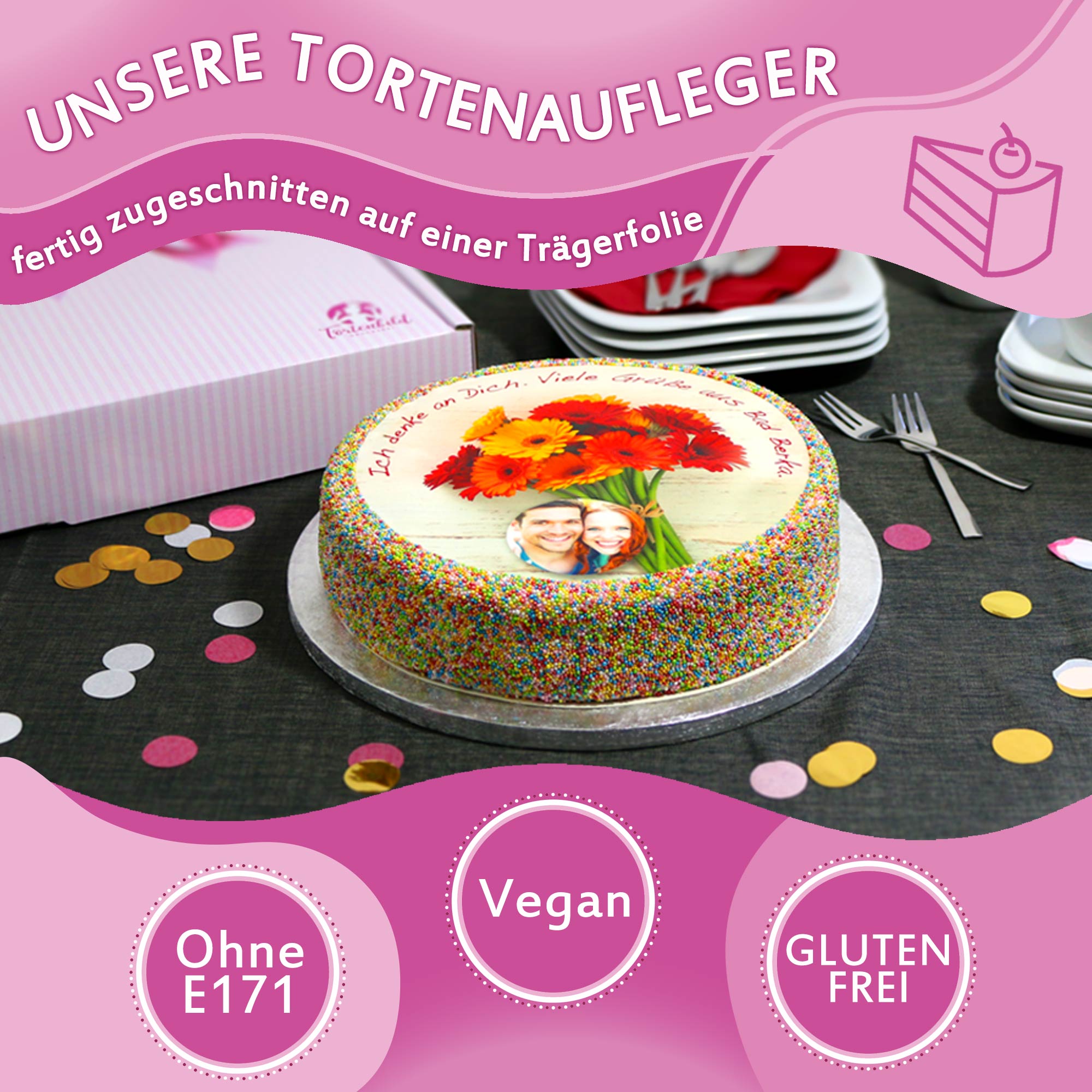 Die Versiegelung aus essbaren Schellack wird von uns auf Ihren Tortenaufleger aufgebracht. Sie schützt vor schnellem Durchweichen und bringt einen leichten Glanz auf das Zuckerbild.