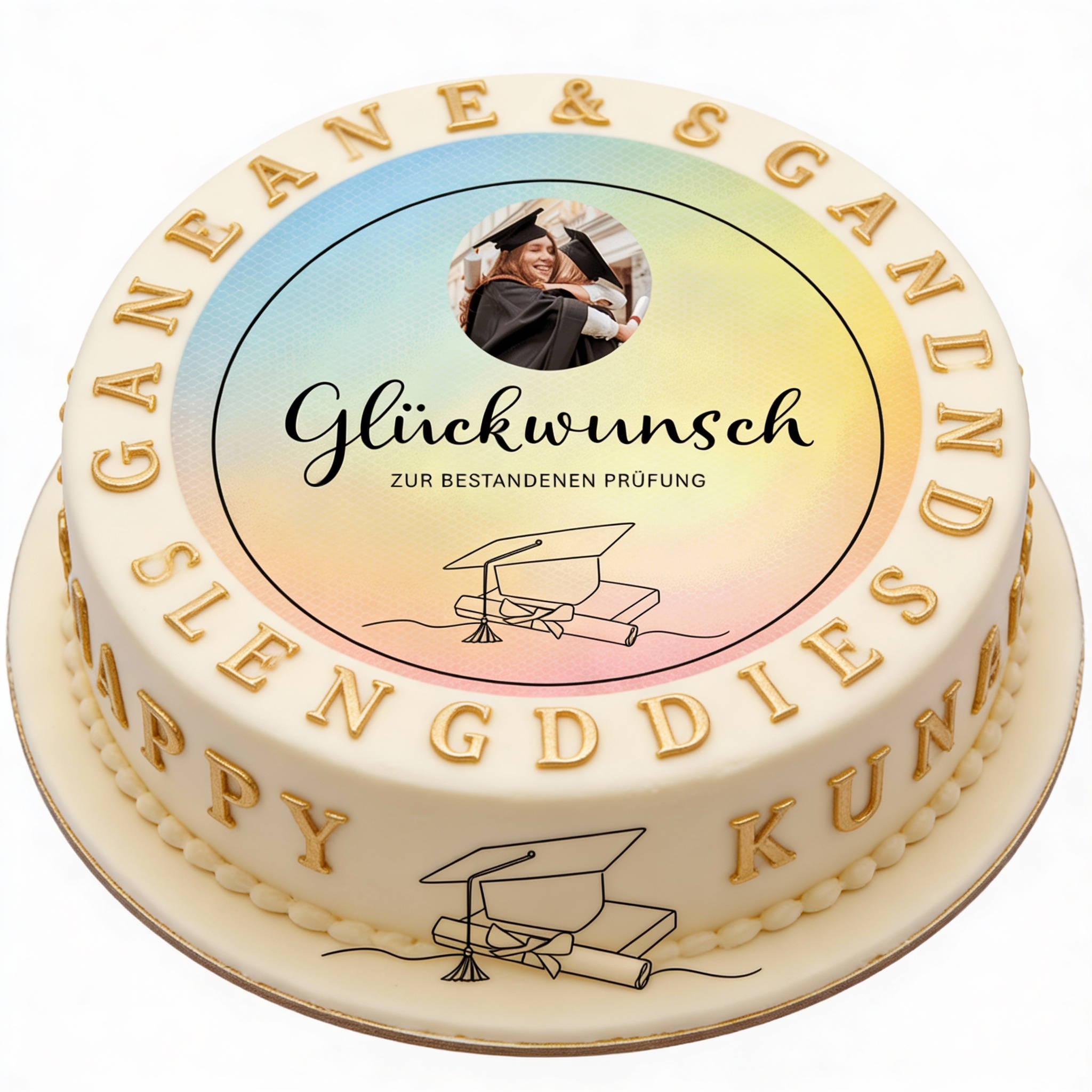 Tortenbild Motivaufleger mit Foto „Glückwunsch zur bestandenen Prüfung“