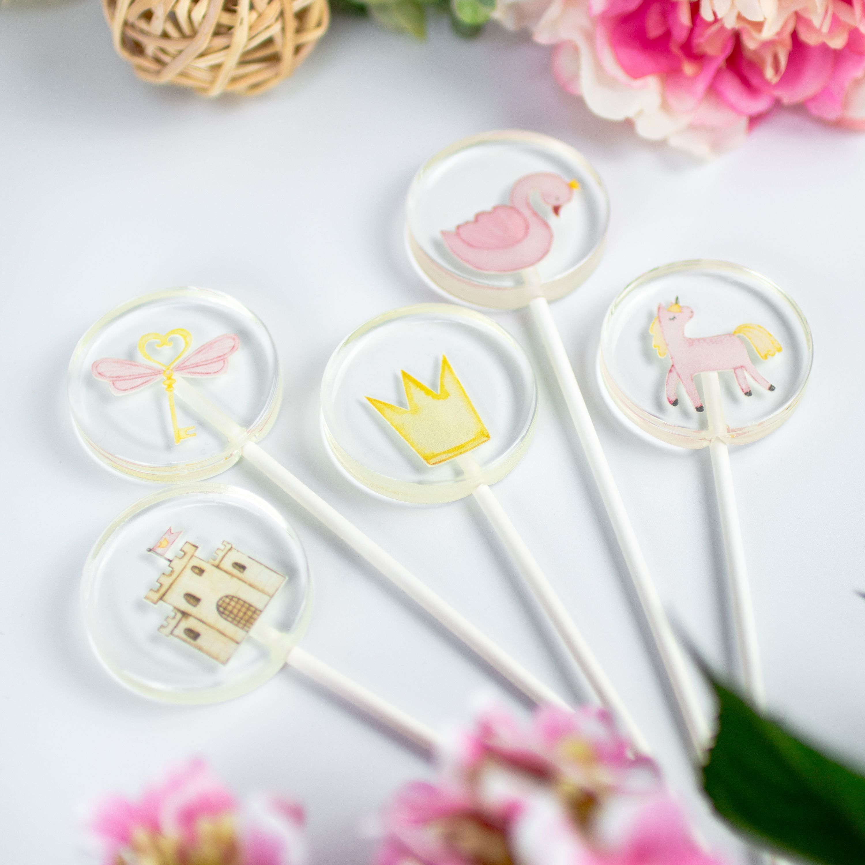 Die transparenten Lollis mit zarten Pastell-Designs eignen sich ideal als Mitgebsel, Tischdekoration oder süßes Gastgeschenk für kleine Prinzessinnen. Besonders schön wirken sie auch auf einer Candybar oder als dekoratives Element bei einer Motto-Party rund um Prinzessin, Märchen oder Einhorn.