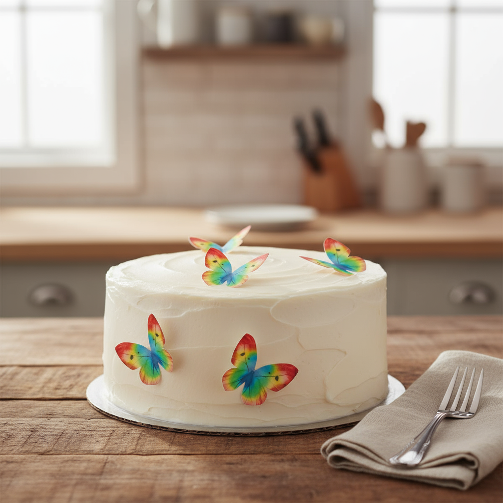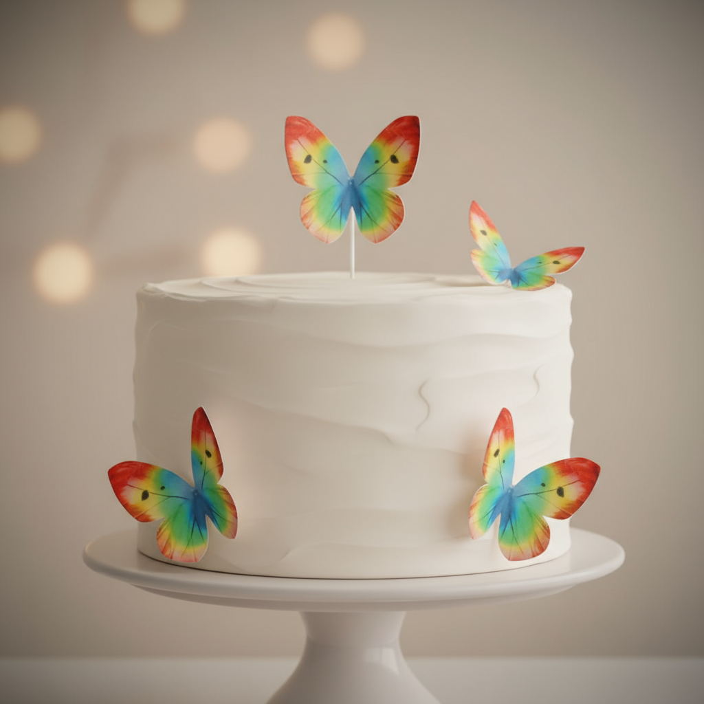 Die zarten, filigranen Schmetterlinge in bunten Regenbogenfarben – von blau, über grün, zu gelb und rot – verleihen jedem Gebäckstück eine leichte, verspielte und elegante Note.