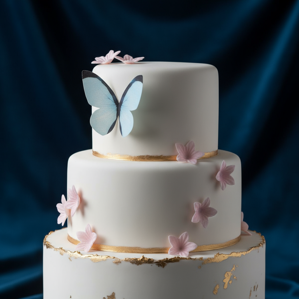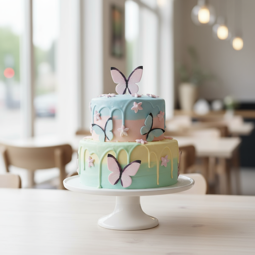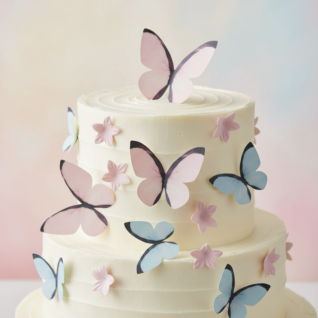 Zart, verspielt und einfach himmlisch – die essbaren Oblatendekorationen Schmetterlinge & Blumen in Pastell Pink und Blau bringen einen Hauch von Leichtigkeit und Eleganz auf deine süßen Kreationen.