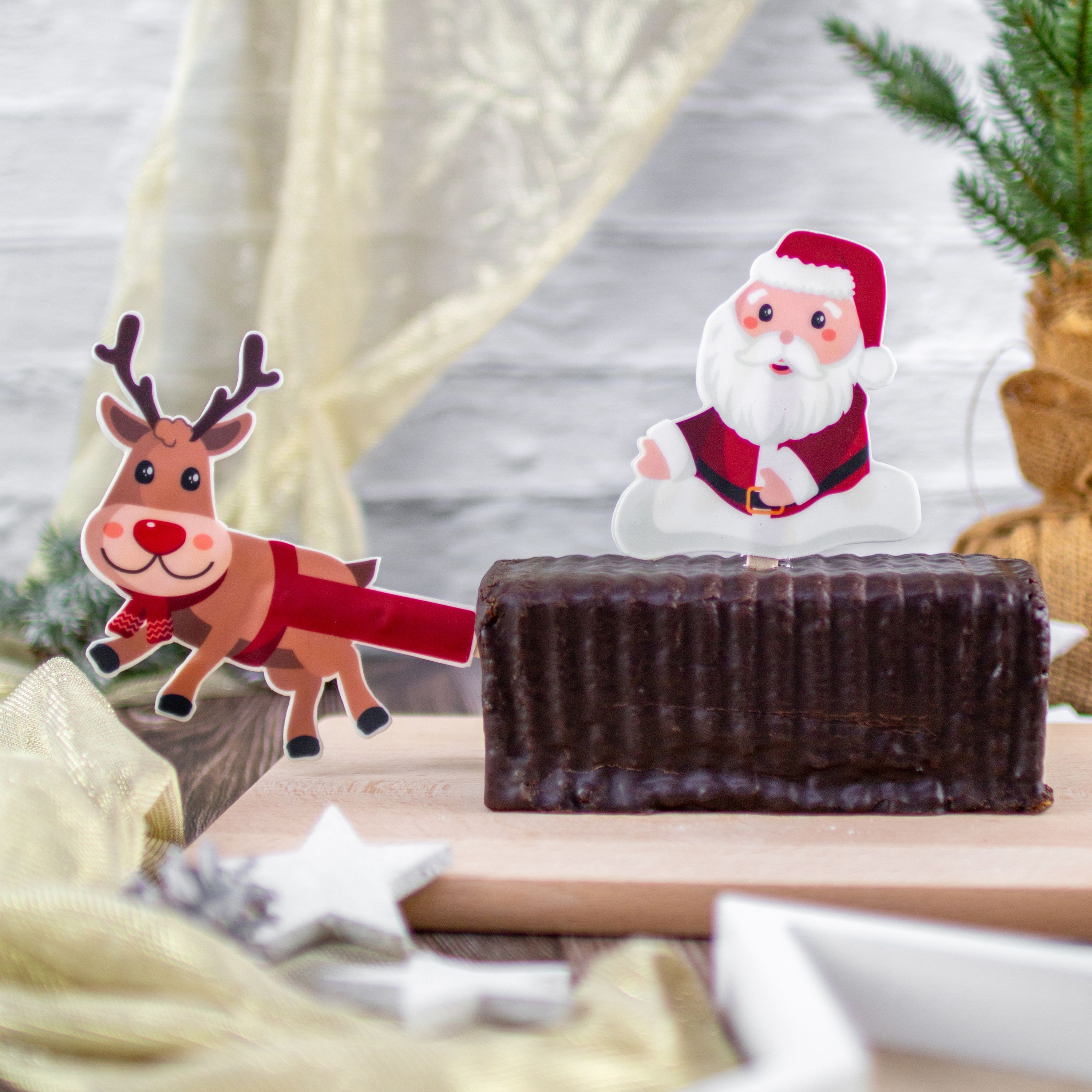 Bringe festliche Stimmung auf den Tisch mit dem Fondant Kastenkuchen-Einstecker-Set „Weihnachtsmann & Rentier Rudolph“!