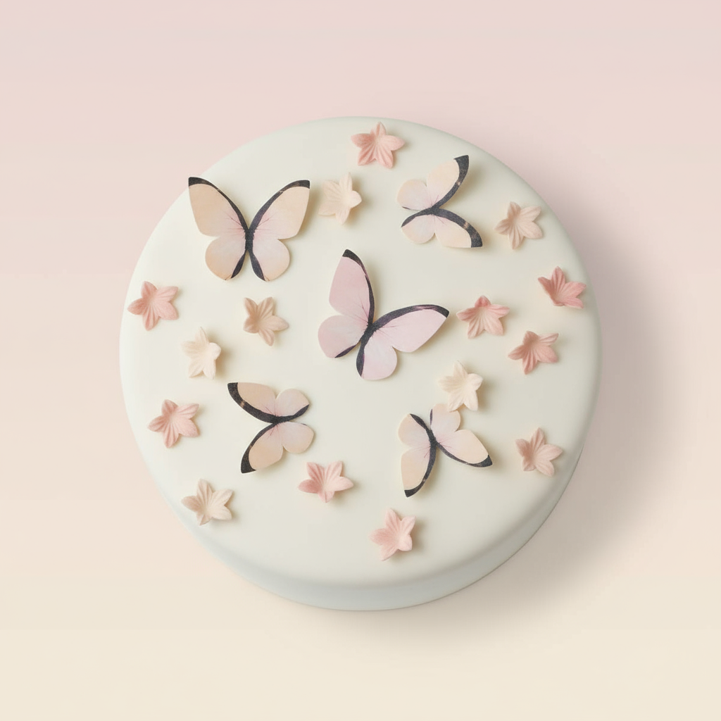 Verleihe deinen Kreationen einen Hauch von Frühling und Leichtigkeit mit den essbaren Oblatendekorationen Schmetterlinge & Blumen Ombre Rosa.
