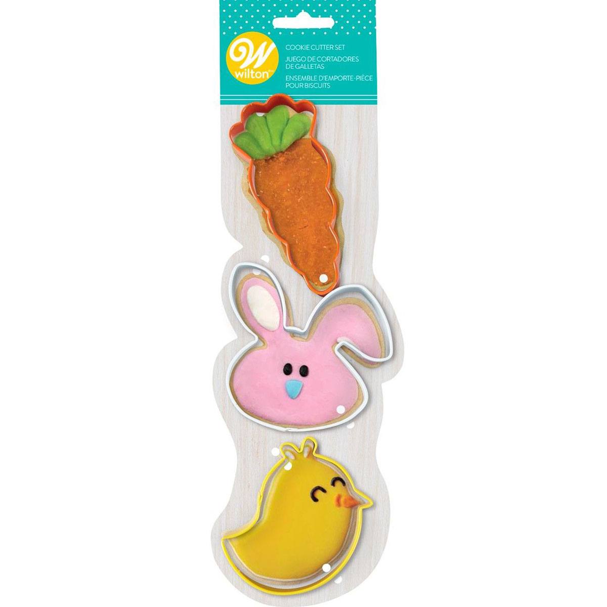 Backen Sie zu Ostern mit Ihren Kindern leckere Kekse mit diesem dreiteiligen Ausstecher-Set von Wilton. Das Set enthält drei Metall-Ausstecher in Form einer Möhre, eines Hasen und eines Kükens.